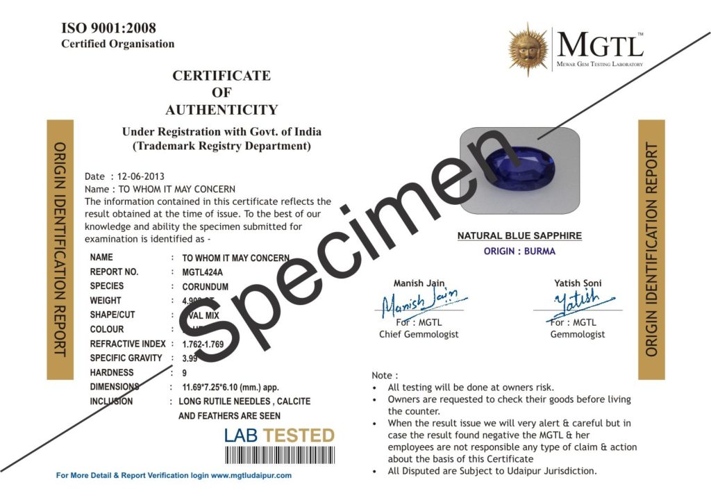 Being one of the best Gemstones testing Laboratory in Rajasthan since 2007, Mewar Gem Testing Laboratory (MGTL) provides most Genuine and Authentic lab Certification. We provide complete Gem Testing services and certificate for Gemstones and Gemstone Jewellery.