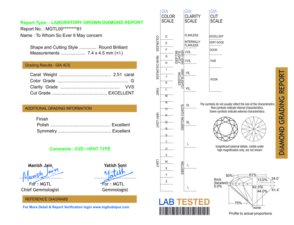 Thus we provide complete testing of lab grown diamonds and provide a certificate for the same with all possible details. Lab Grown Diamond Testing Fees at MGTL is also very affordable.