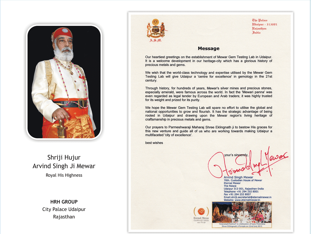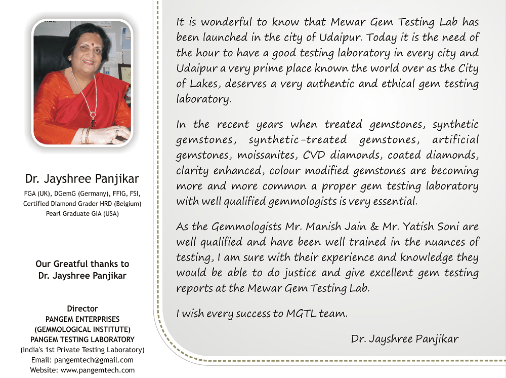 Recognition & Certificates The Mewar Gem Laboratory is renowned and certified by many personalities including Shri. Arvind Singh Ji Mewar , Dr. Jayshree Panjikar.